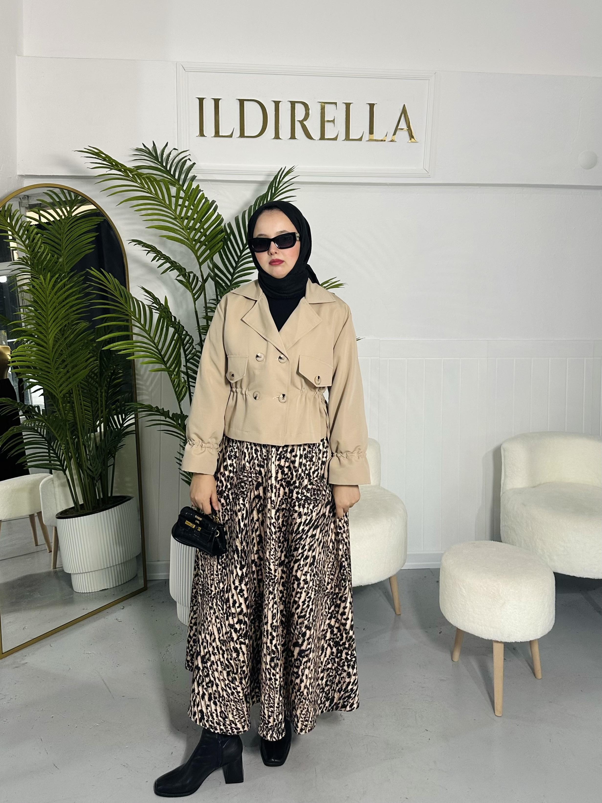 Bel büzgülü tasarım: Yanlarda ip/lastik büzgü detayı var; bele oturuşunu ayarlayabiliyorsun. İsteğe göre daha salaş ya da daha vücuda oturan bir formda kullanılabiliyor.